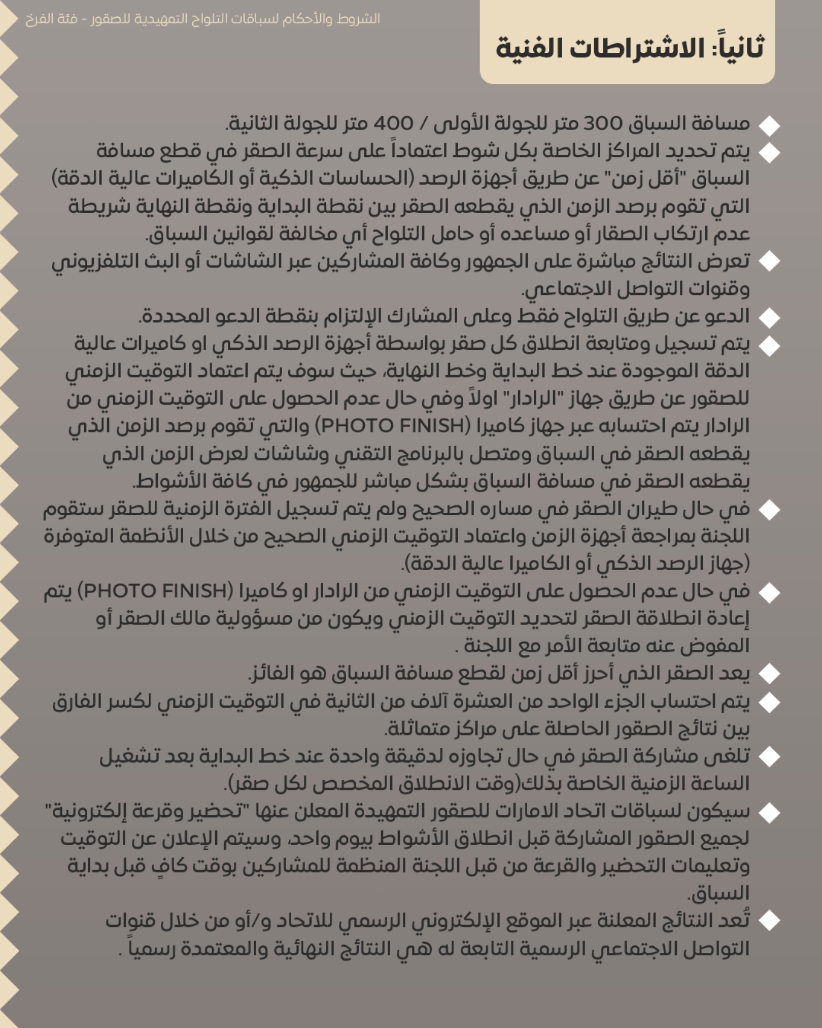 الجولة الثانية: لمسافة 400 متر خلال الفترة من 19 الى 22 نوفمبر 2025، وتشمل شوطين إضافيين لفئات حر ( انتاج مزارع ) وشاهين ( انتاج مزارع ) لفئة العامة.