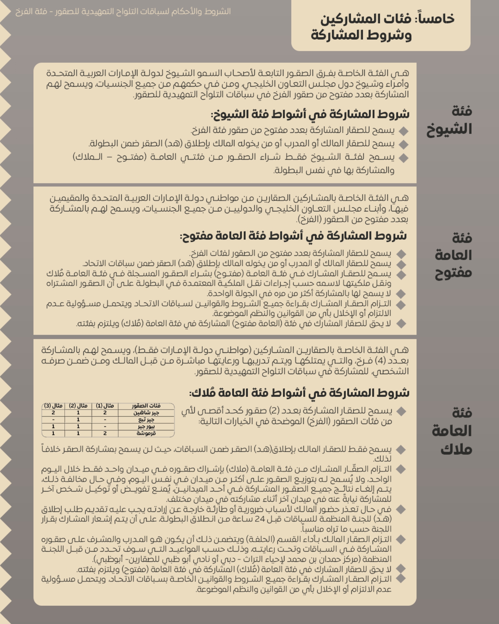 كما تتضمن السباقات عدة فئات من الصقور المشاركة مثل جير تبع وجير شاهين و جير بيور وقرموشة جير، وتقام الأشواط ضمن فئات العامة - المفتوح والعامة مُلاك بمشاركة نخبة من الصقارين من مختلف إمارات الدولة.