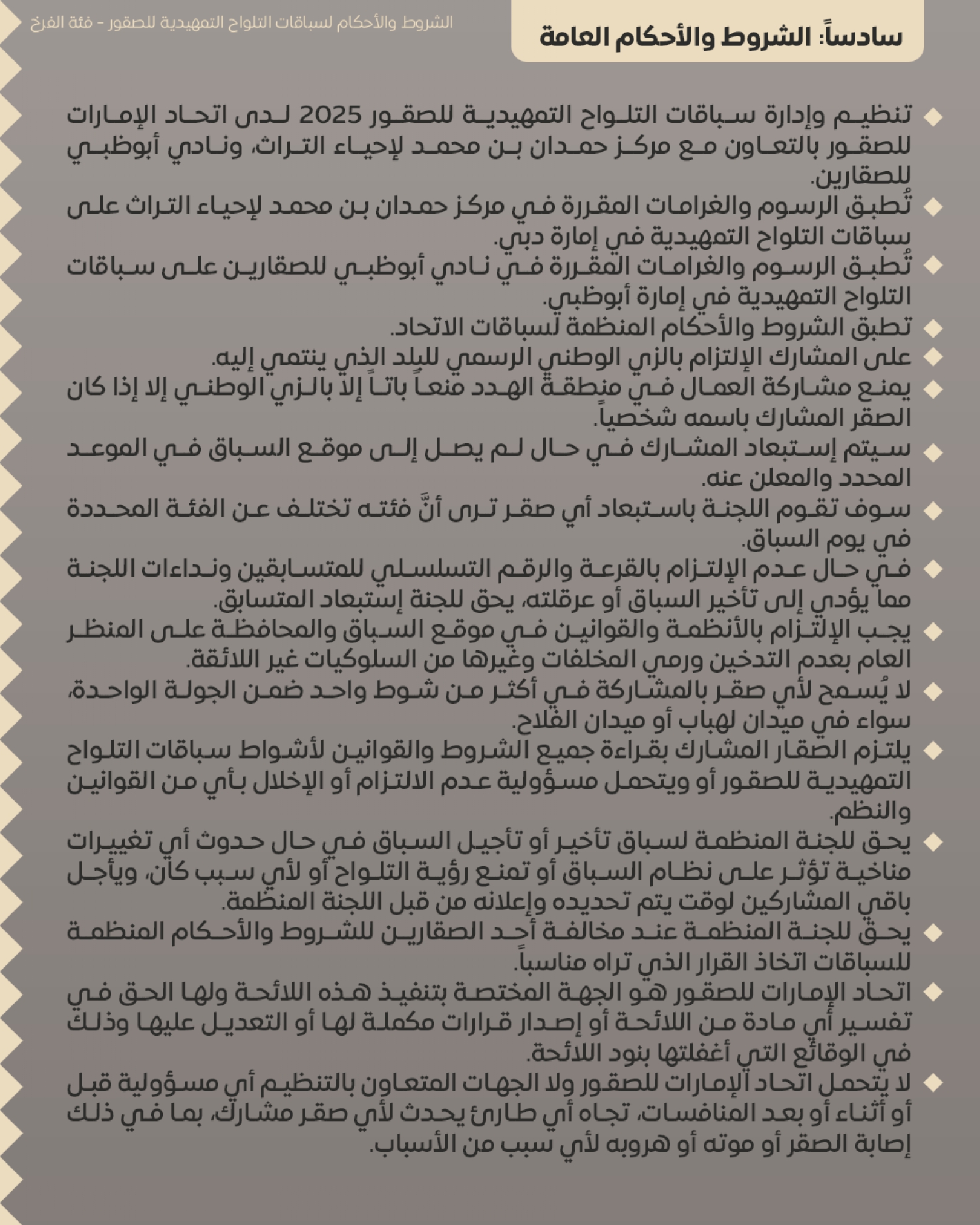 ينظم اتحاد الإمارات العربية المتحدة للصقور بالتعاون مع نادي أبوظبي للصقارين سباقات التلواح التمهيدية لموسم 2025/2026 في ميدان الفلاح - أبوظبي، ضمن جهود دعم رياضة الصيد بالصقور والحفاظ على موروث الصقارة باعتبارها جزءاً أصيلاً من الهوية الثقافية لدولة الإمارات. حيث تقام المنافسات على جولتين: