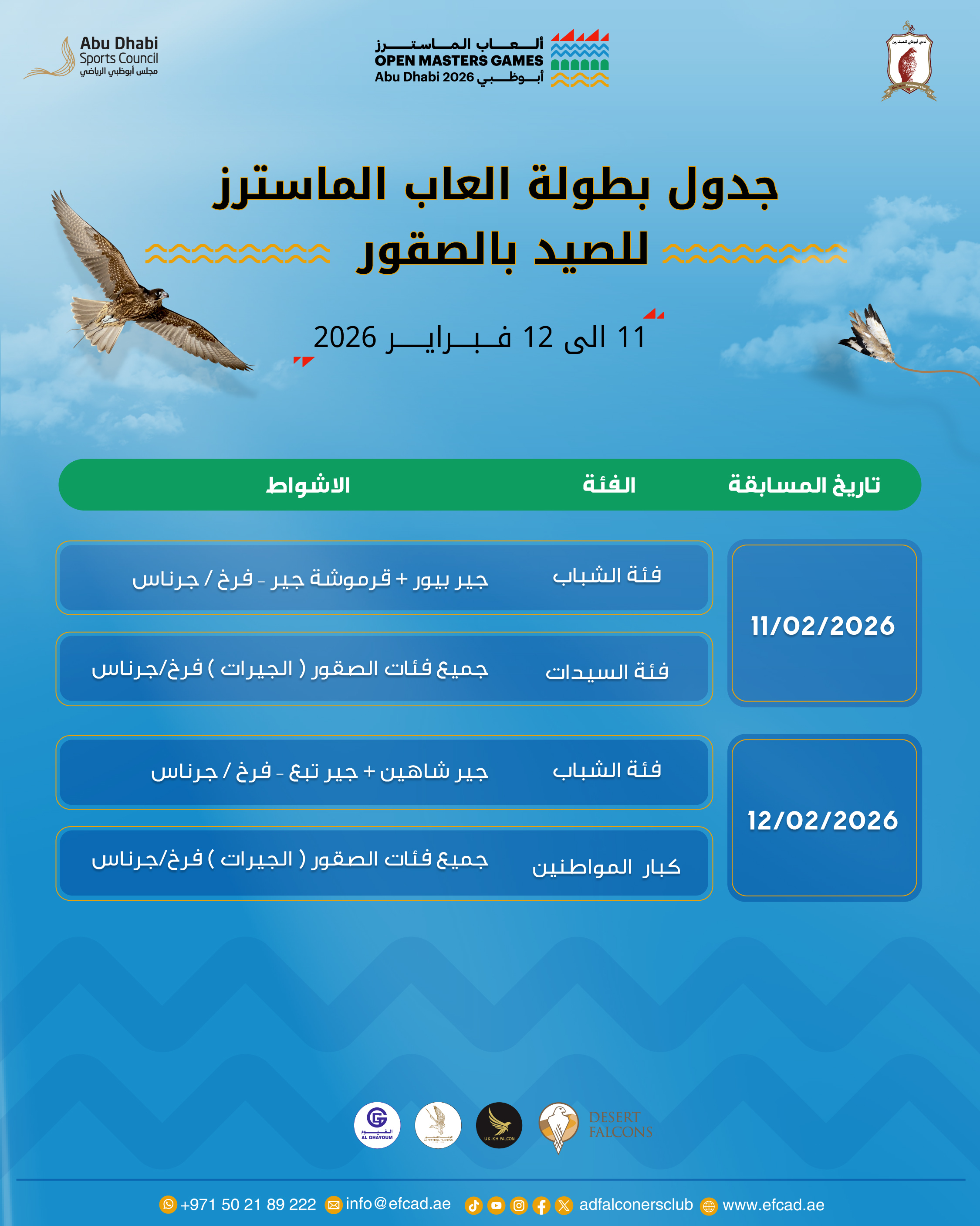 يُنظم نادي أبوظبي للصقّارين بطولة ألعاب الماسترز للصيد بالصقور 2026، وذلك ضمن فعاليات ألعاب الماسترز أبوظبي 2026 وعلى هامش برنامجها الرسمي، في إطار رؤيته الاستراتيجية الرامية إلى صون التراث الإماراتي الأصيل وتعزيز استدامته. وتأتي البطولة بمشاركة فئات مجتمعية متنوعة تشمل الشباب وكبار المواطنين والسيدات، من خلال أشواط مخصصة تعزز الشمول المجتمعي وتدعم نقل الخبرات بين الأجيال، بما يعكس كفاءة النادي وقدرته على تنظيم البطولات التراثية في يوم تنافسي واحد وفق أعلى المعايير التنظيمية والفنية.