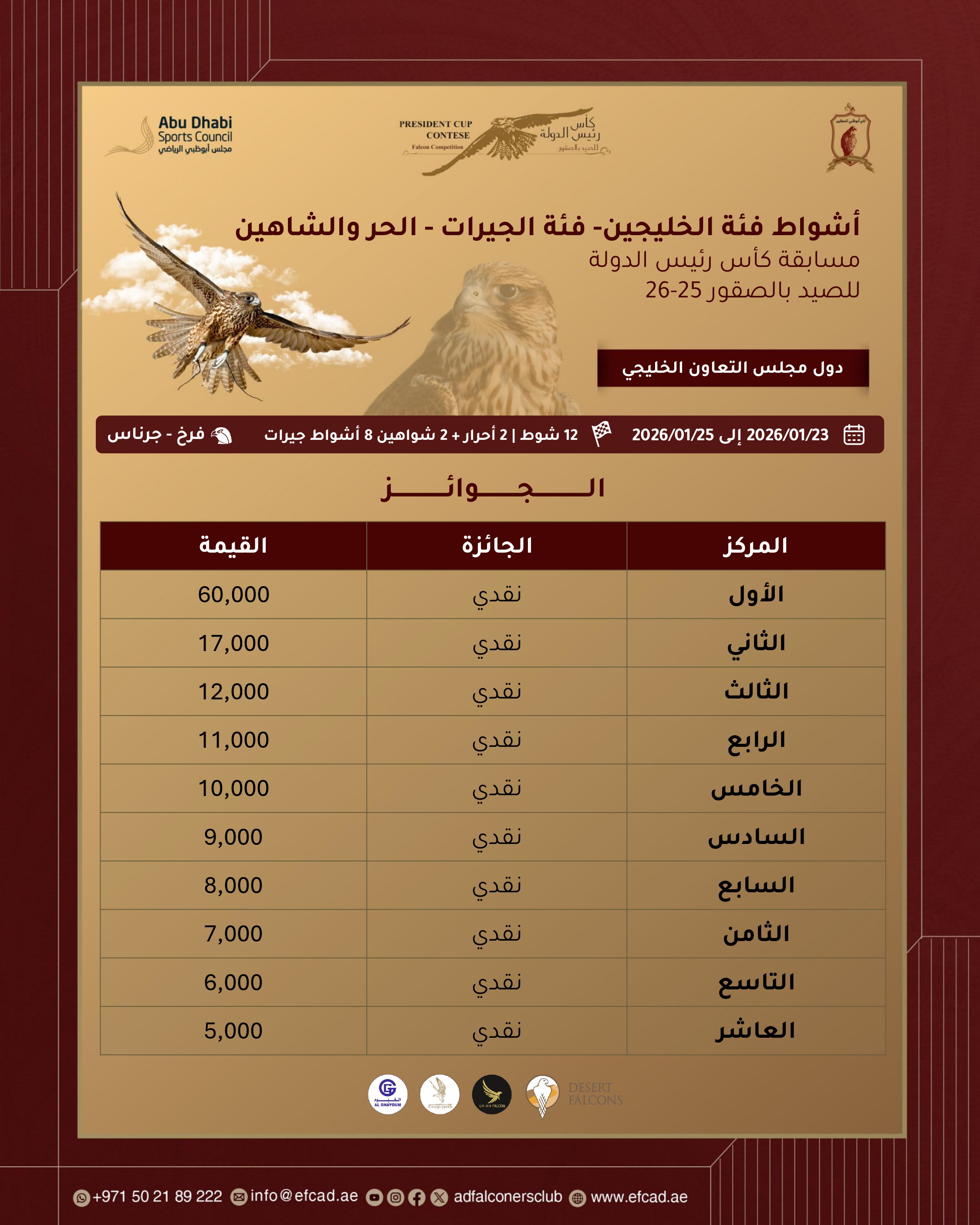 أُقسم بالله العظيم، أن جميع هذه الصقور التي أشارك بها في مسابقة كأس صاحب السمو رئيس الدولة للصيد بالصقور 2025/2026 هي ملكي الخاص وبأشرافي وعلى نفقتي وتدريبي المباشر منذ بداية امتلاكي لها ولم يقم أي شخص أو جهة خاصة أو عامة بتدريبها (إلا في حالات المهمات الخاصة بالعمل). وان هذه الصقور التي أشارك بها في فئة العامة/ الملاك لم أدخل بغيرها في فئة العامة / المفتوح، ولم اقم بالإشراف أو التدريب لأي صقر من الصقور المشاركة في الأشواط للفئات الأخرى في هذه المسابقة، وإنني لم ألجأ الى أي حيلة أو تحايل في هذا أو شيء آخر يخالف شروط المسابقة. والله على ما أقول شهيد.