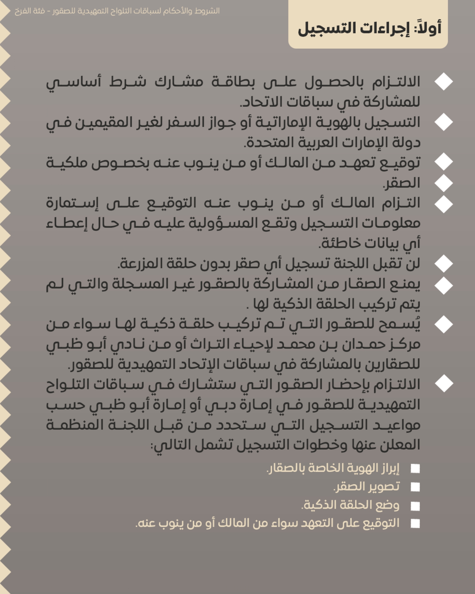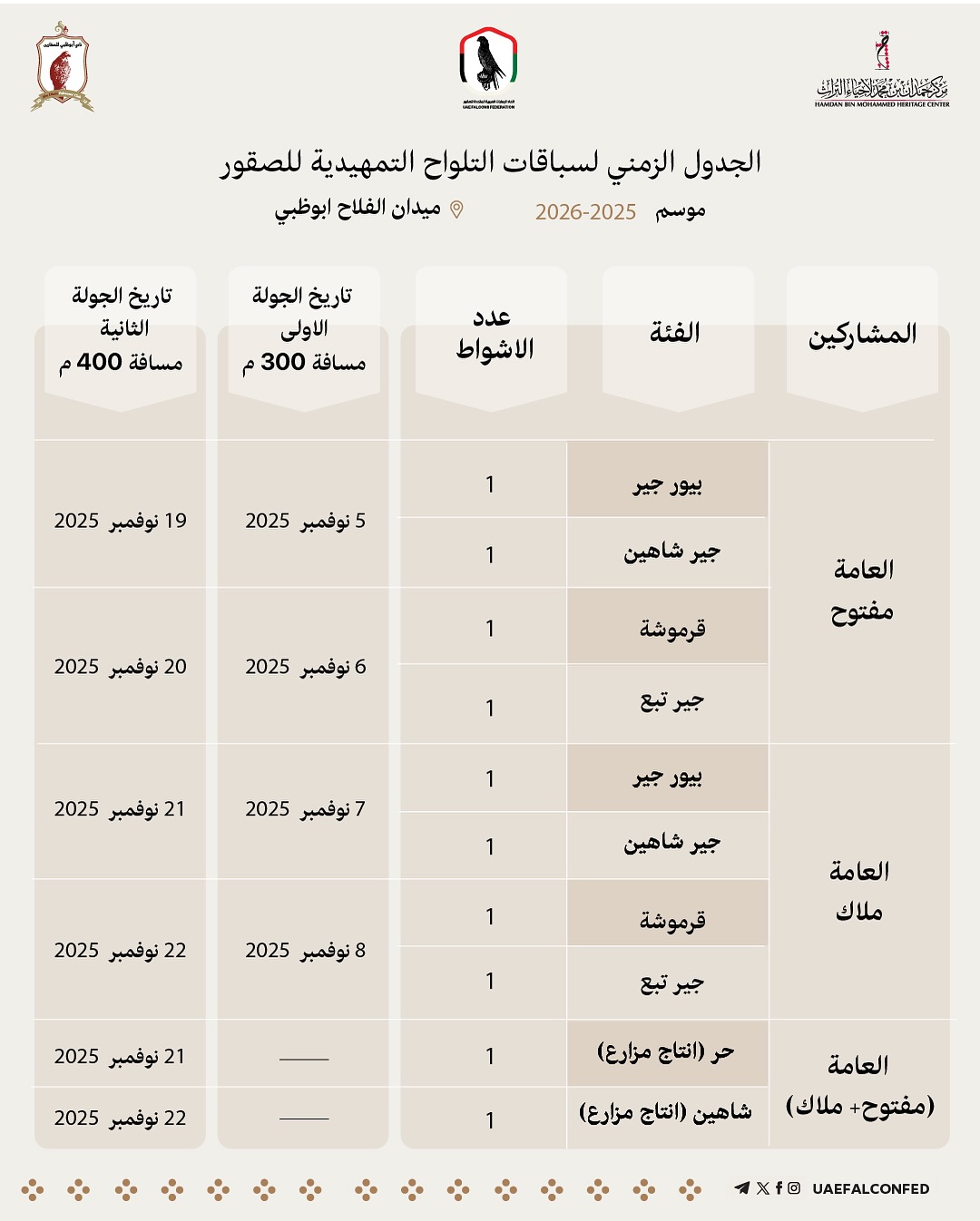 ينظم اتحاد الإمارات العربية المتحدة للصقور بالتعاون مع نادي أبوظبي للصقارين سباقات التلواح التمهيدية لموسم 2025/2026 في ميدان الفلاح - أبوظبي، ضمن جهود دعم رياضة الصيد بالصقور والحفاظ على موروث الصقارة باعتبارها جزءاً أصيلاً من الهوية الثقافية لدولة الإمارات. حيث تقام المنافسات على جولتين: