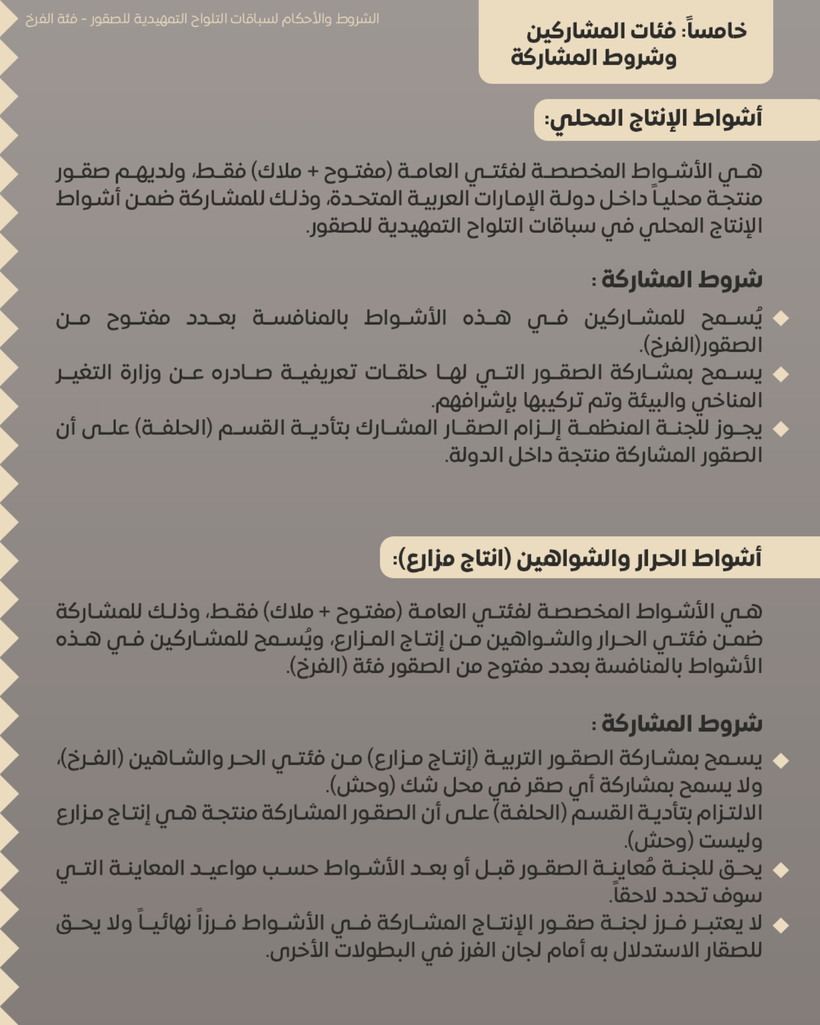 كما تتضمن السباقات عدة فئات من الصقور المشاركة مثل جير تبع وجير شاهين و جير بيور وقرموشة جير، وتقام الأشواط ضمن فئات العامة - المفتوح والعامة مُلاك بمشاركة نخبة من الصقارين من مختلف إمارات الدولة.