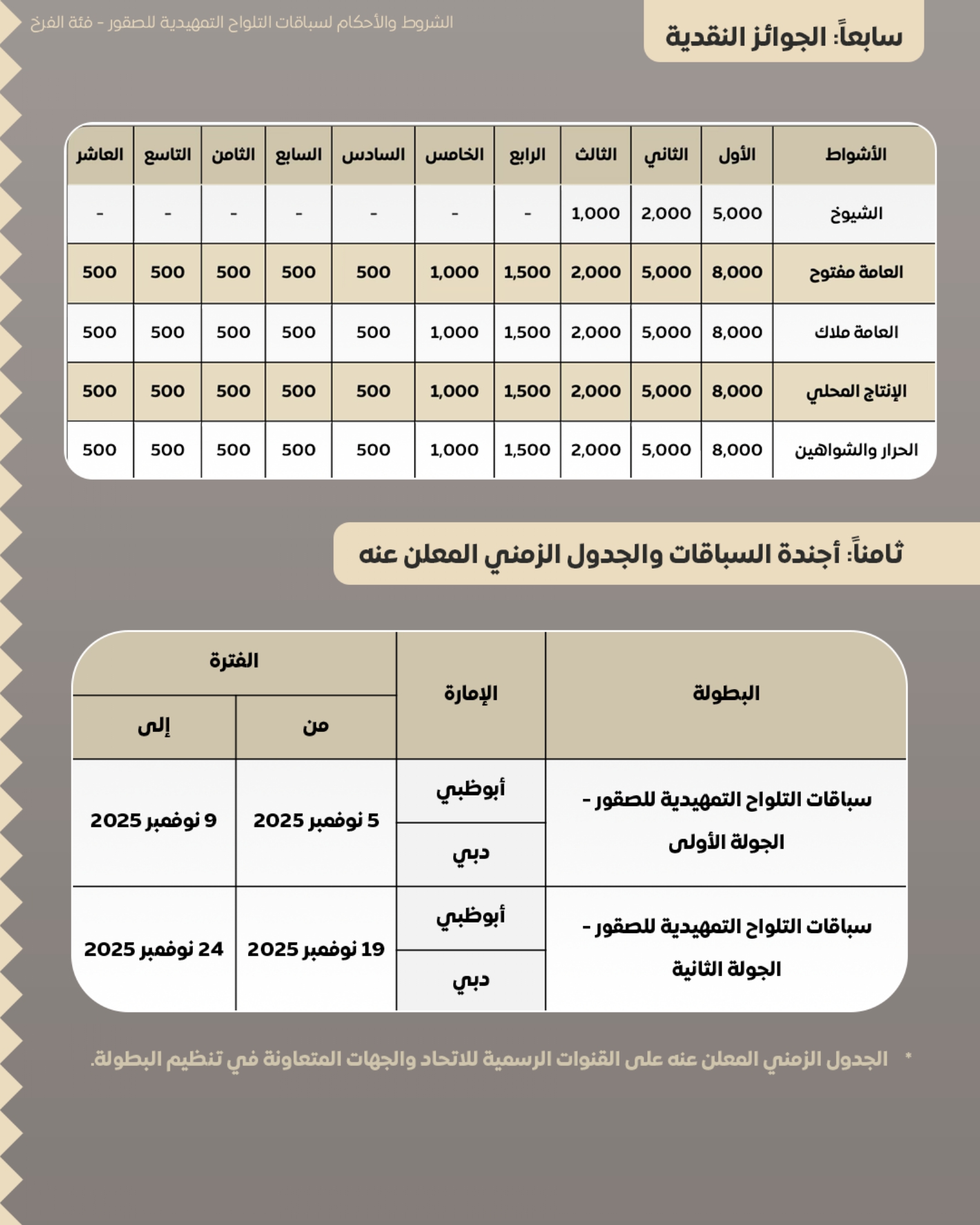 الجولة الثانية: لمسافة 400 متر خلال الفترة من 19 الى 22 نوفمبر 2025، وتشمل شوطين إضافيين لفئات حر ( انتاج مزارع ) وشاهين ( انتاج مزارع ) لفئة العامة.