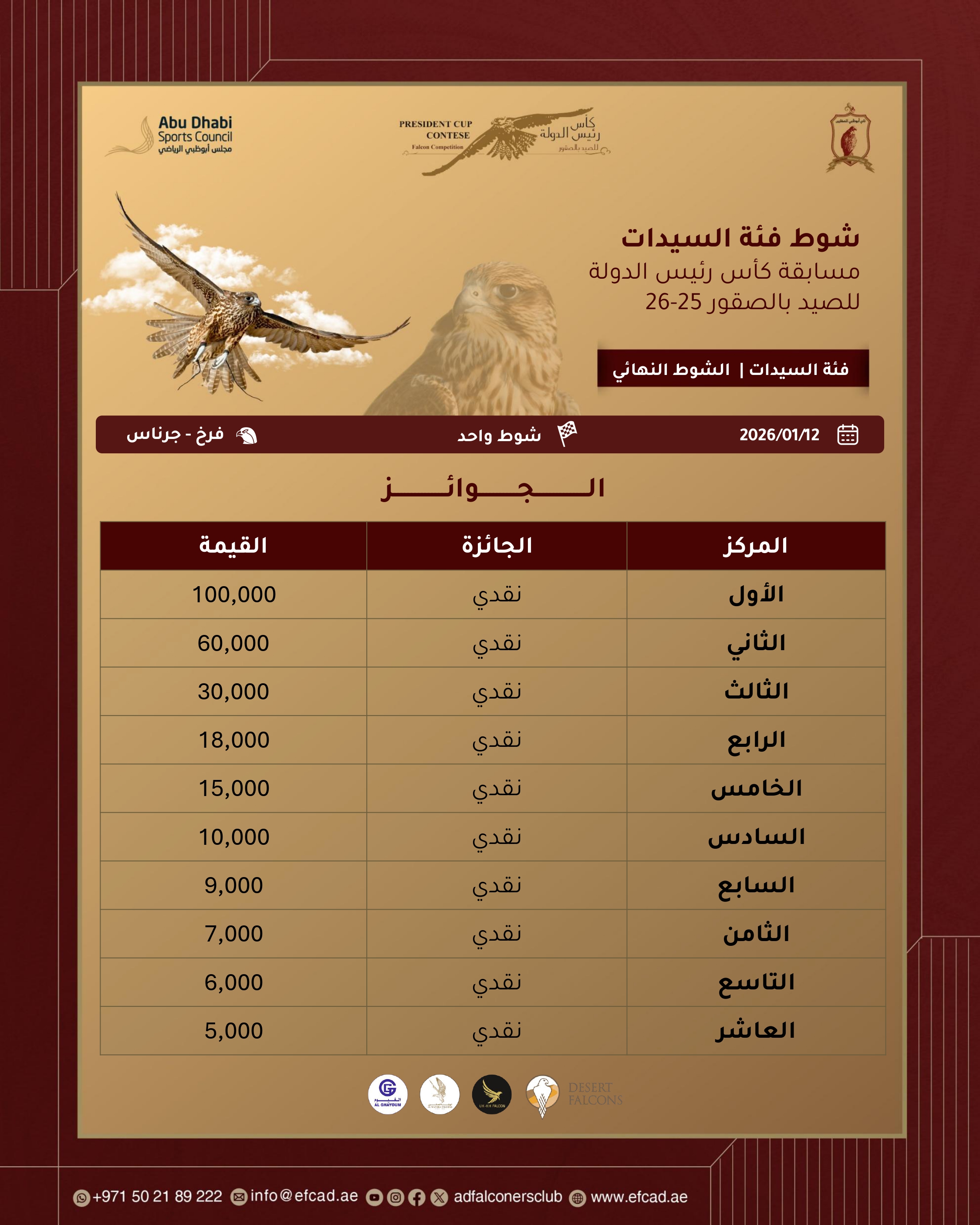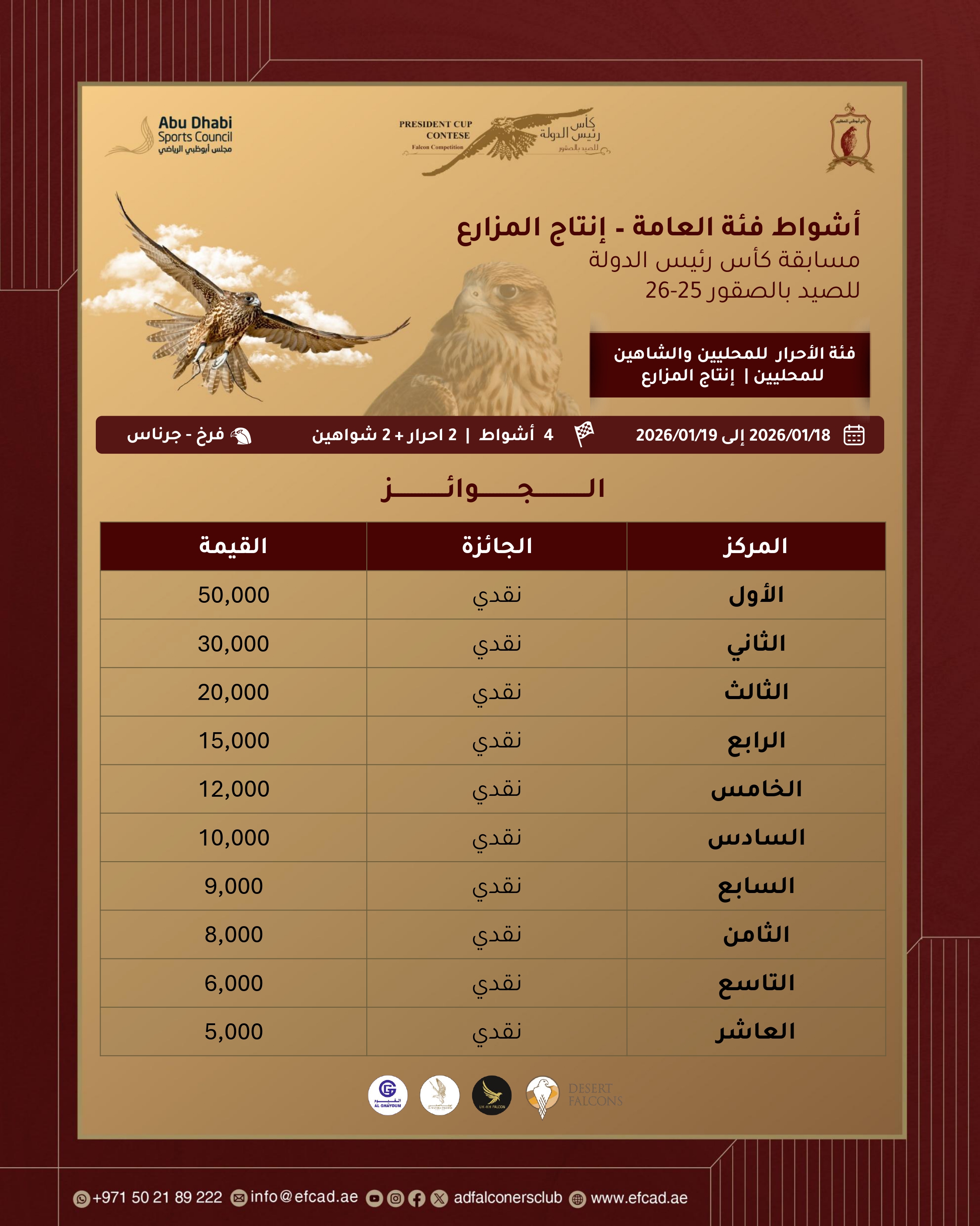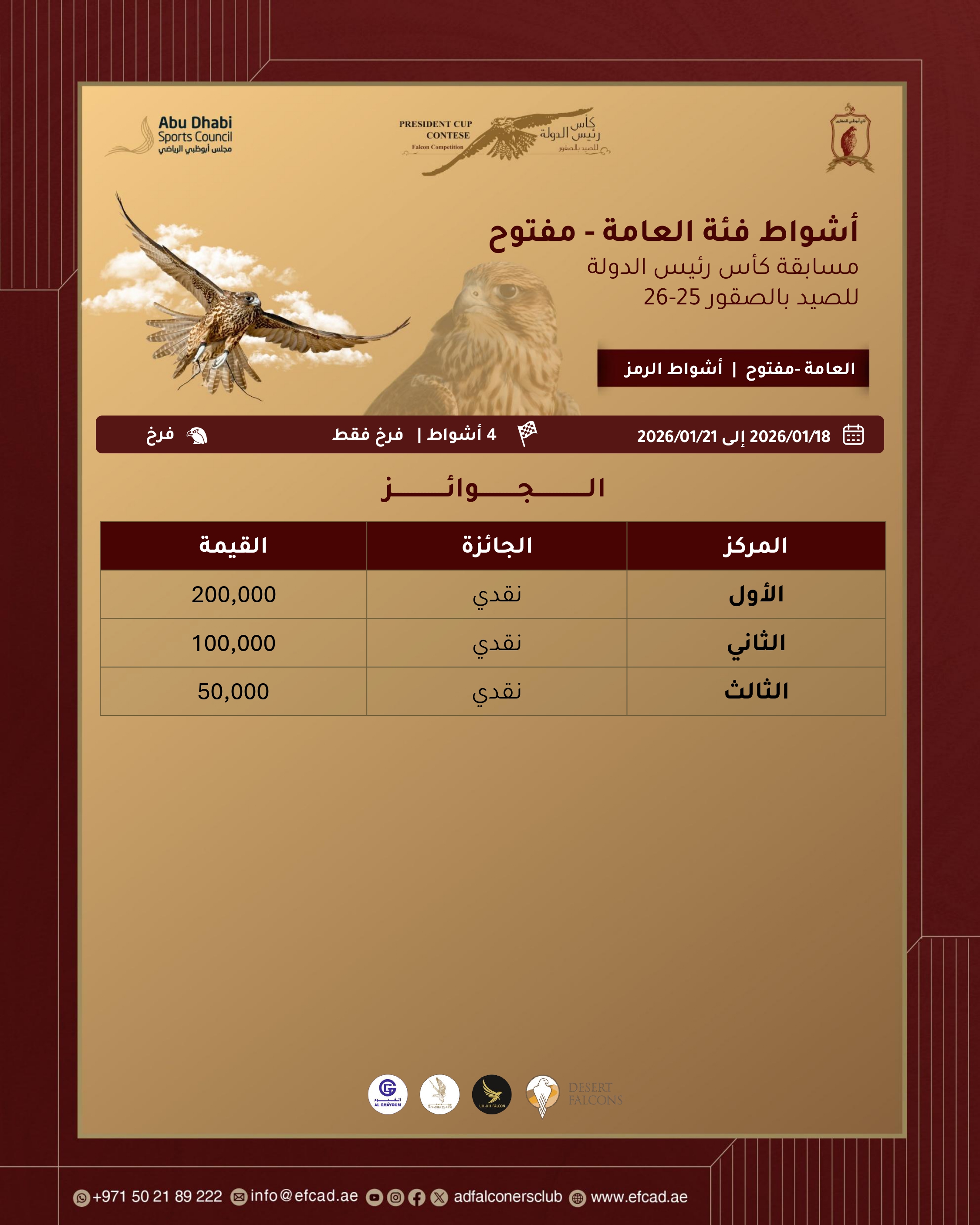 أُقسم بالله العظيم، أن جميع هذه الصقور التي أشارك بها في مسابقة كأس صاحب السمو رئيس الدولة للصيد بالصقور 2025/2026 هي ملكي الخاص وبأشرافي وعلى نفقتي وتدريبي المباشر منذ بداية امتلاكي لها ولم يقم أي شخص أو جهة خاصة أو عامة بتدريبها (إلا في حالات المهمات الخاصة بالعمل). وان هذه الصقور التي أشارك بها في فئة العامة/ الملاك لم أدخل بغيرها في فئة العامة / المفتوح، ولم اقم بالإشراف أو التدريب لأي صقر من الصقور المشاركة في الأشواط للفئات الأخرى في هذه المسابقة، وإنني لم ألجأ الى أي حيلة أو تحايل في هذا أو شيء آخر يخالف شروط المسابقة. والله على ما أقول شهيد.