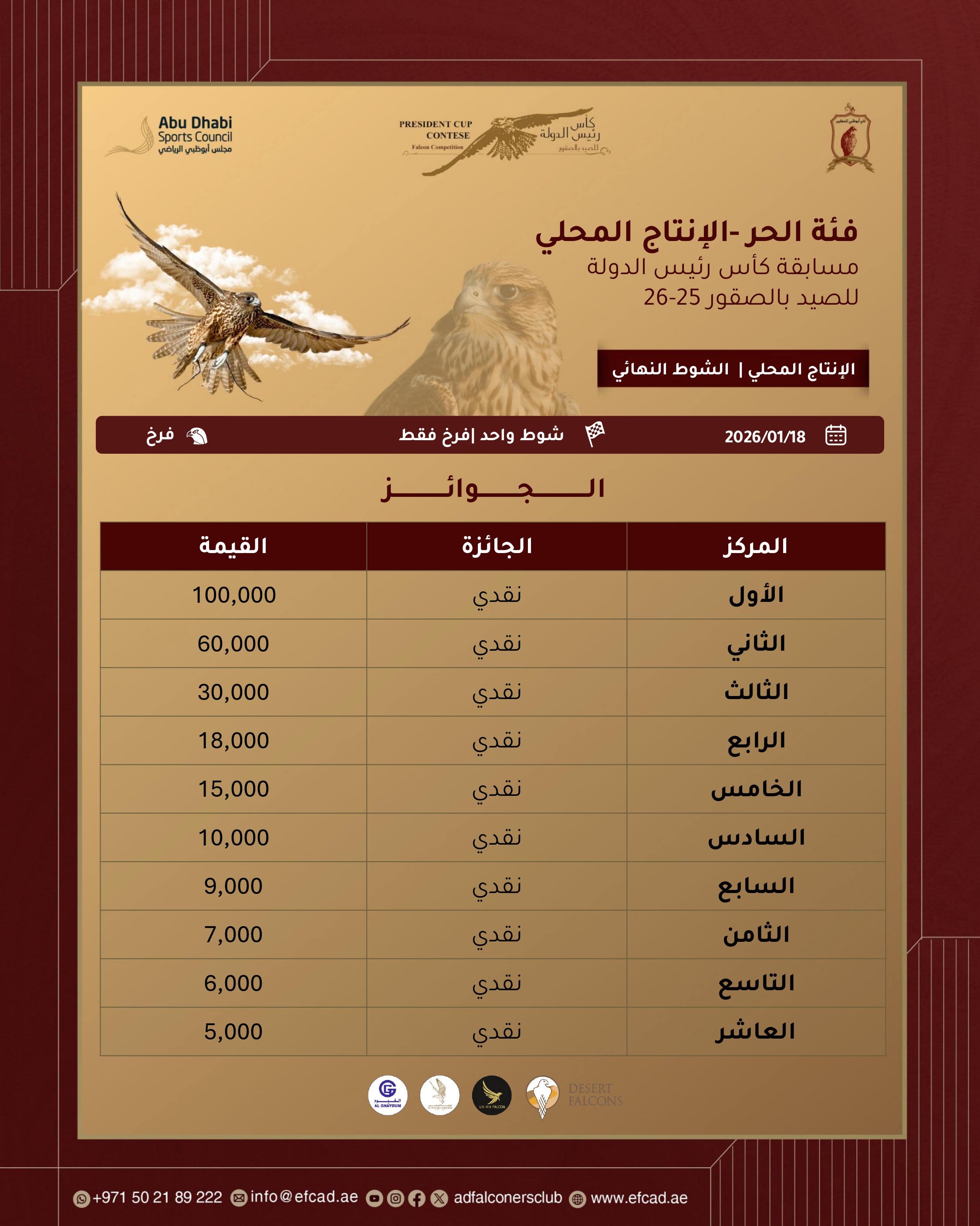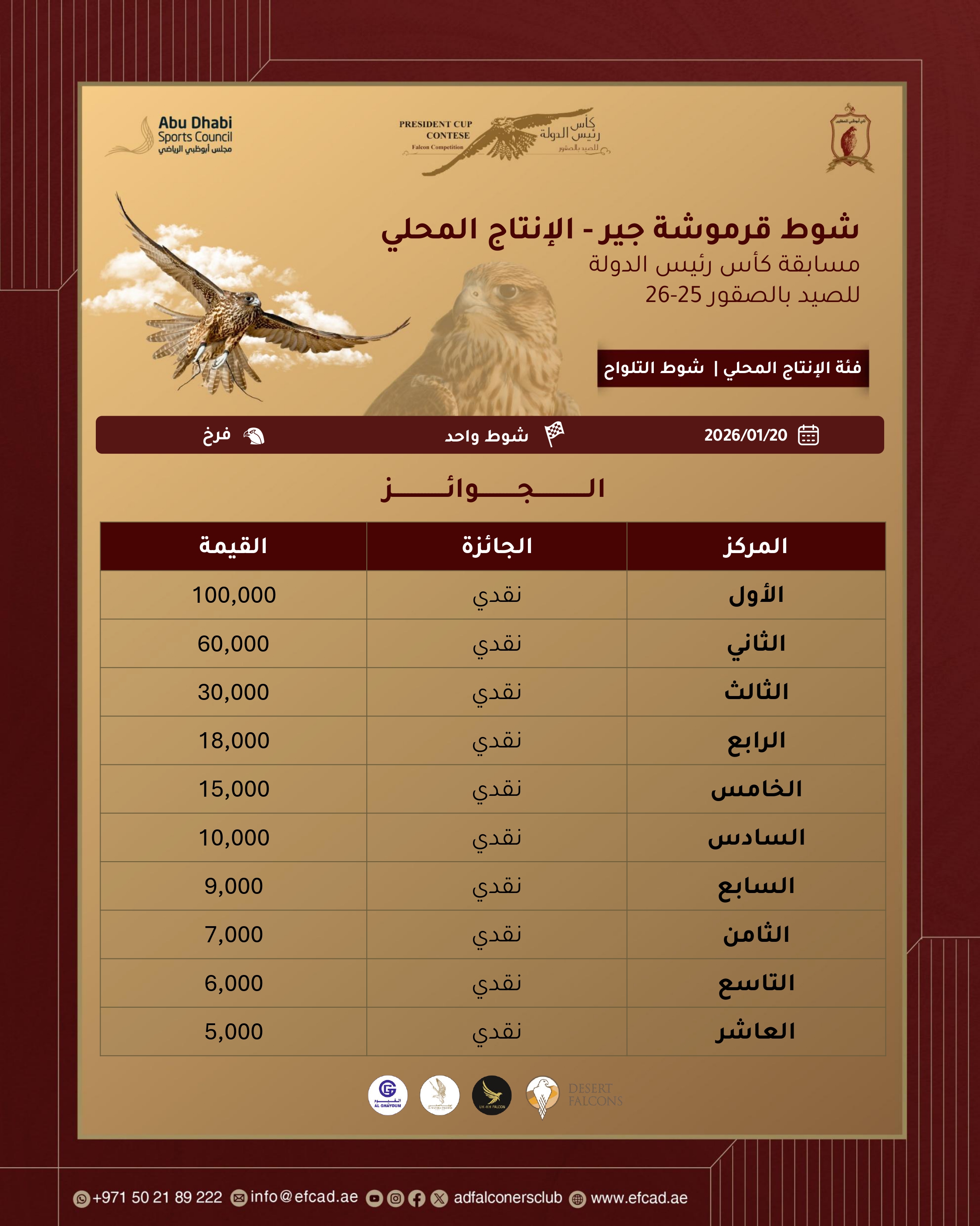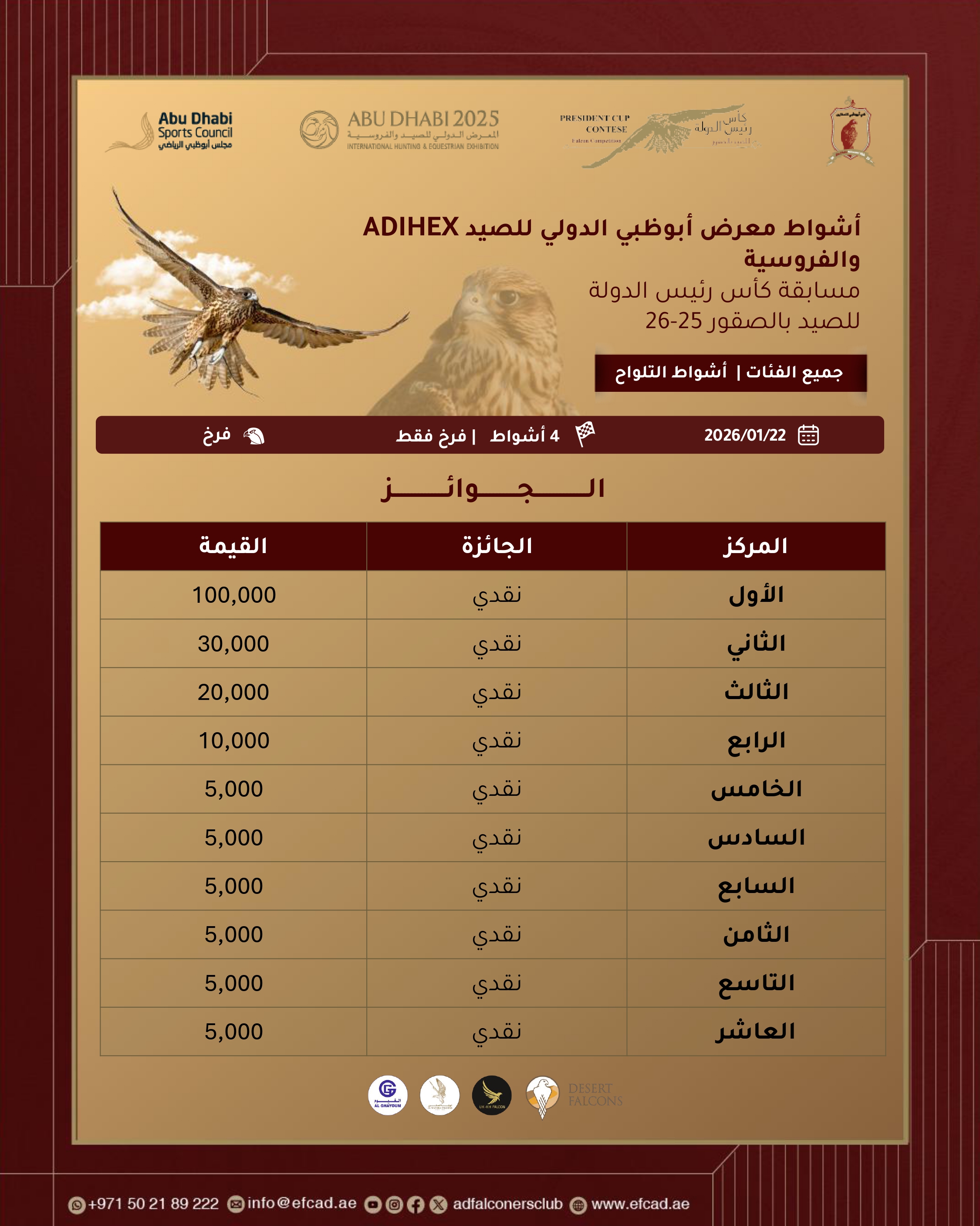 أُقسم بالله العظيم، أن جميع هذه الصقور التي أشارك بها في مسابقة كأس صاحب السمو رئيس الدولة للصيد بالصقور 2025/2026 هي ملكي الخاص وبأشرافي وعلى نفقتي وتدريبي المباشر منذ بداية امتلاكي لها ولم يقم أي شخص أو جهة خاصة أو عامة بتدريبها (إلا في حالات المهمات الخاصة بالعمل). وان هذه الصقور التي أشارك بها في فئة العامة/ الملاك لم أدخل بغيرها في فئة العامة / المفتوح، ولم اقم بالإشراف أو التدريب لأي صقر من الصقور المشاركة في الأشواط للفئات الأخرى في هذه المسابقة، وإنني لم ألجأ الى أي حيلة أو تحايل في هذا أو شيء آخر يخالف شروط المسابقة. والله على ما أقول شهيد.