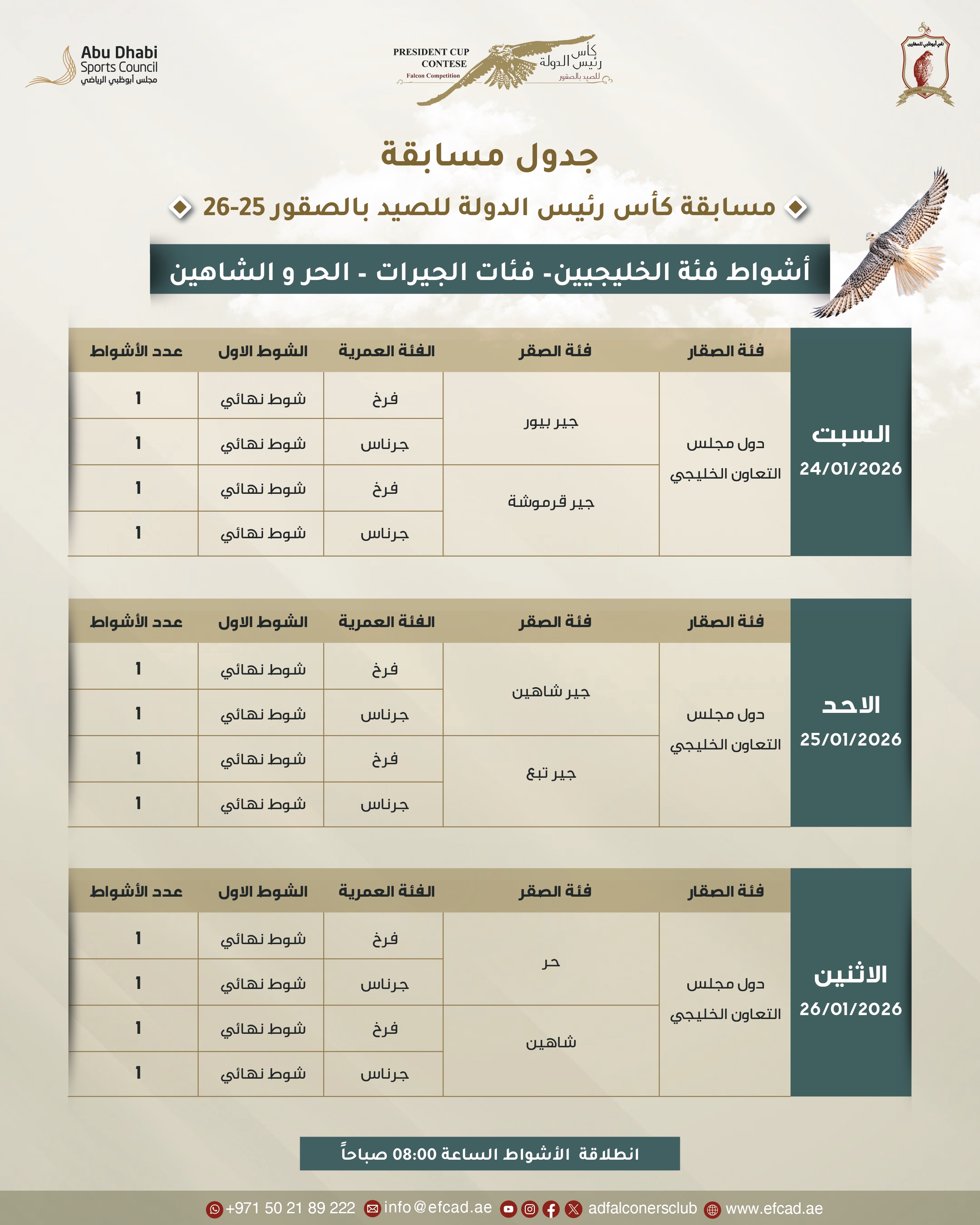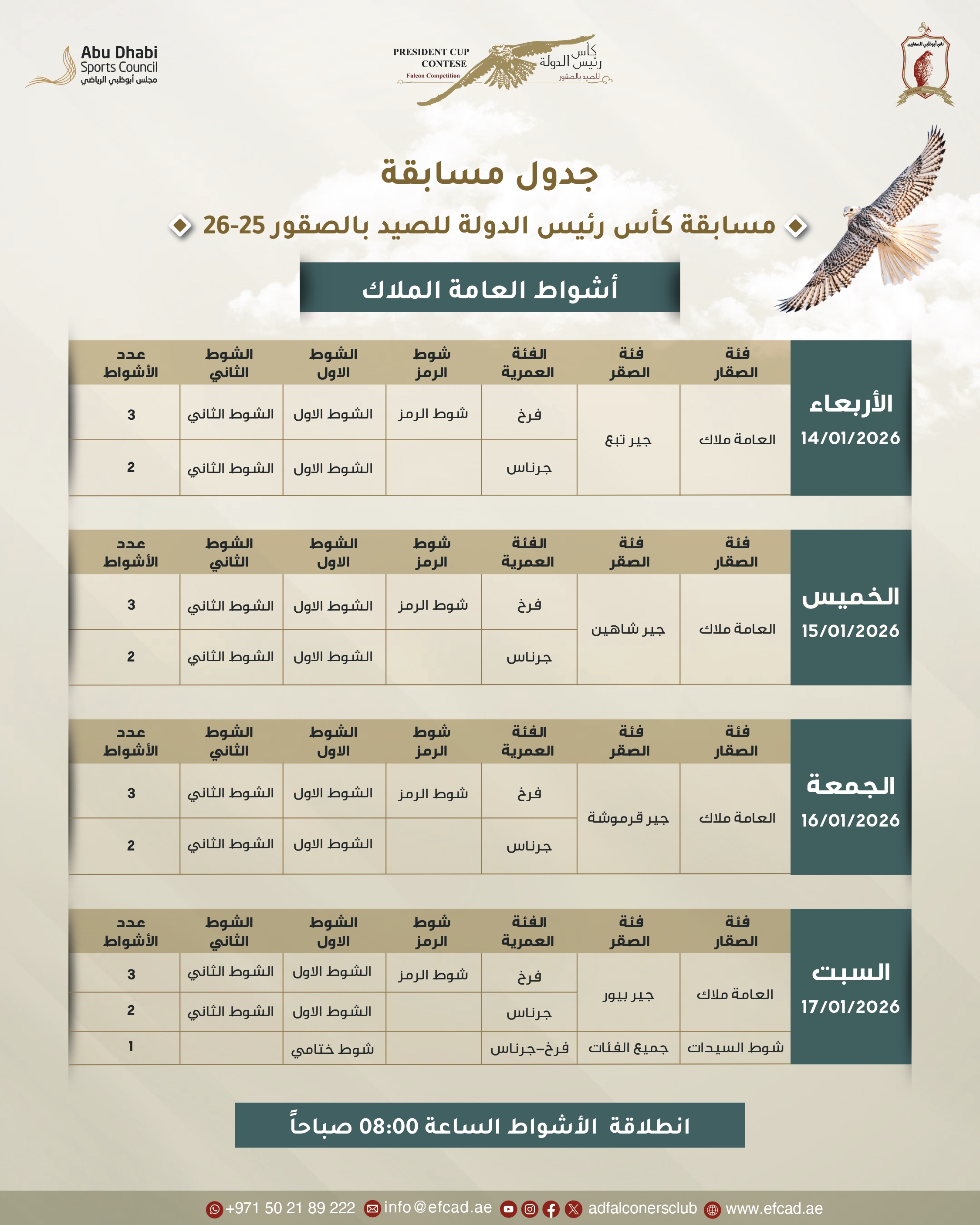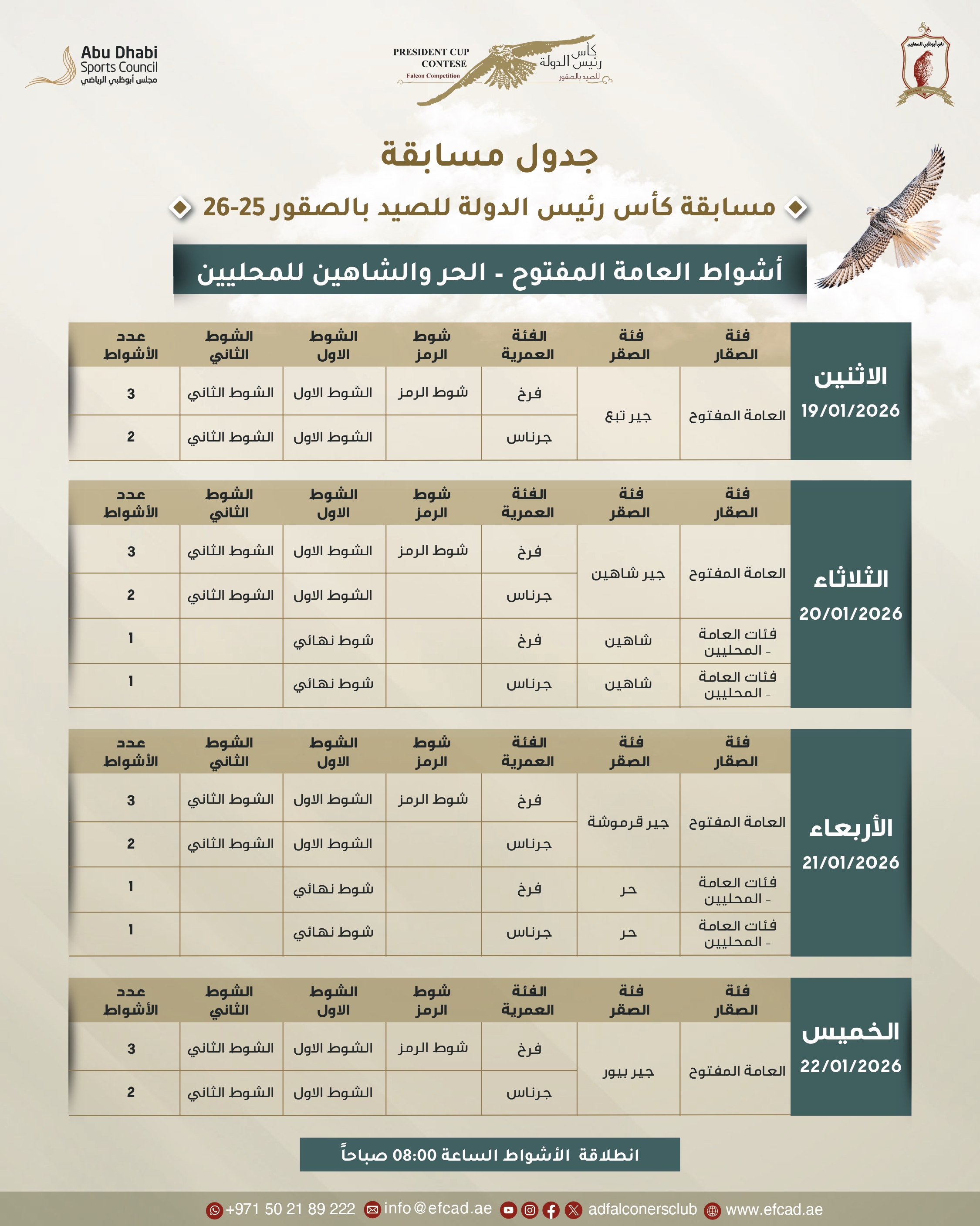 - توقيت التحضير المسبق في خيمة الصقارين او عبر الموقع الالكتروني الرسمي.