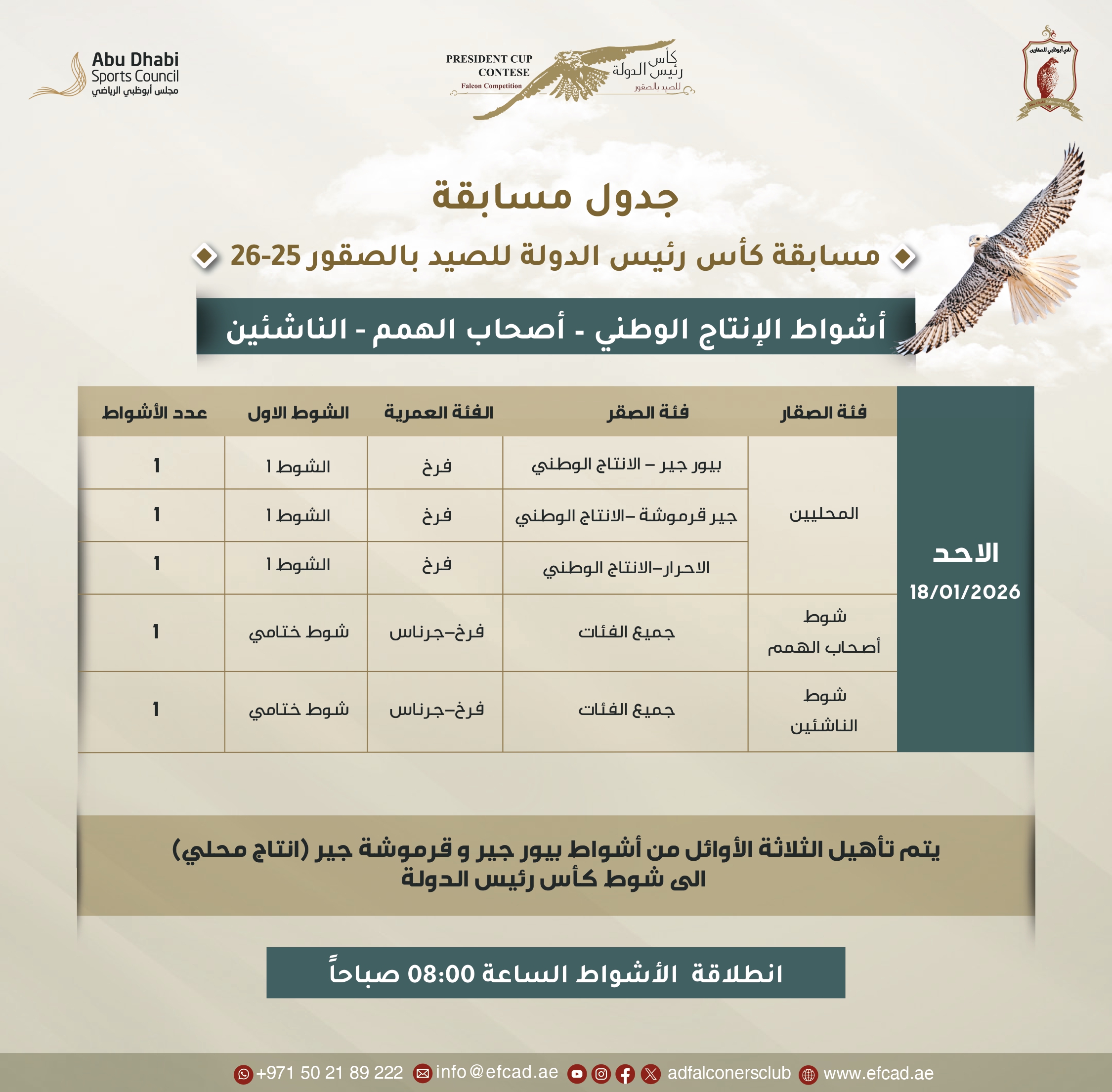 • فئة الإنتاج المحلي : فئة خاصة بالمشاركين بالصقور الأنتاج المحلي الأماراتي .