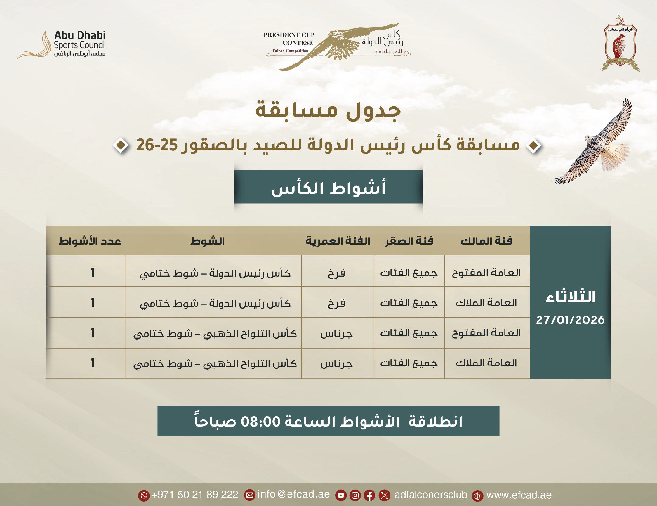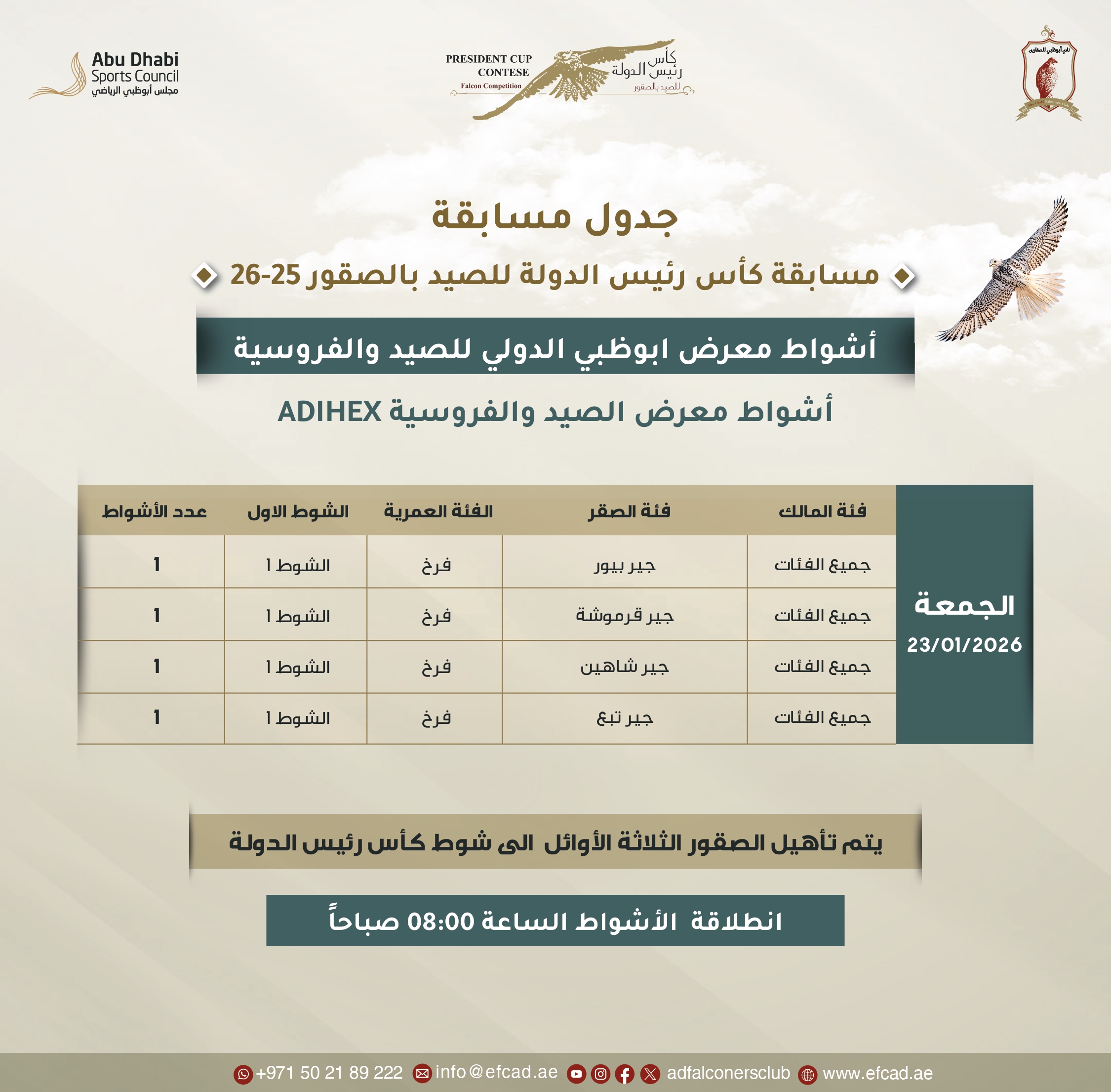 - موقع المسابقة : ميدان نادي أبوظبي للصقارين في منطقة الفلاح– أبوظبي.